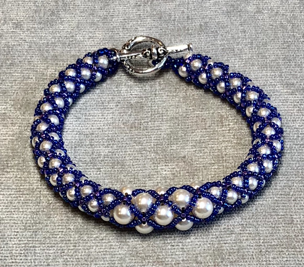 Learn how to make this lovely pearl bracelet while learning the very useful netting stitch! This is a beginning/Intermediate beading class only because it uses size 15o seed beads which can be VERY frustrating for new beaders. Pearls/beads/clasp included in cost. 4mm pearls (about 180-200), 6mm pearls (about 15-20), size 11o Delica beads (a few- like maybe 100) and size 15o seed beads (a fair amount), and a toggle clasp. Class size limited to 6. Cost of this class is $50 and includes the pearls/beads and clasp. Bring size 10 needle and 6lb fireline